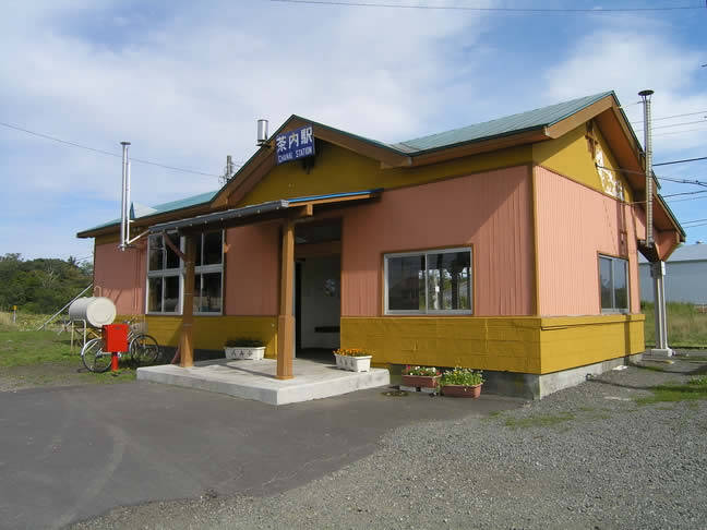 厚床駅の次に降りたのが「茶内駅」。相対式2面2線で、カラフルな駅舎が建っています。