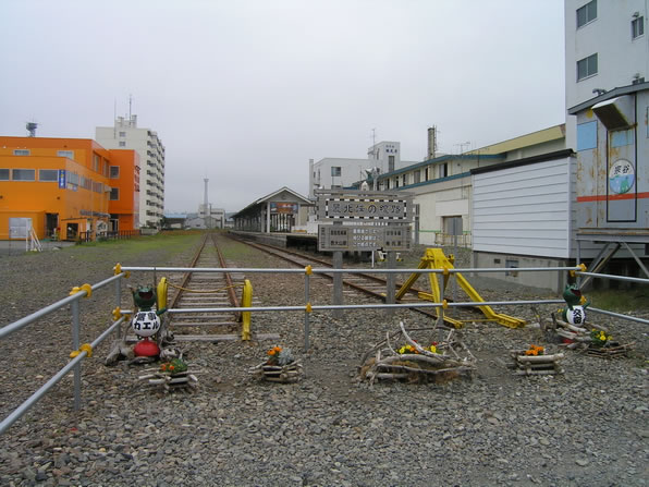「最北端の線路」の看板の脇に、