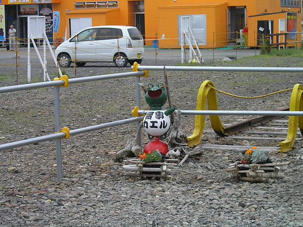 「最北端の線路」の看板の脇に、昨年にはなかった、「無事カエル」という